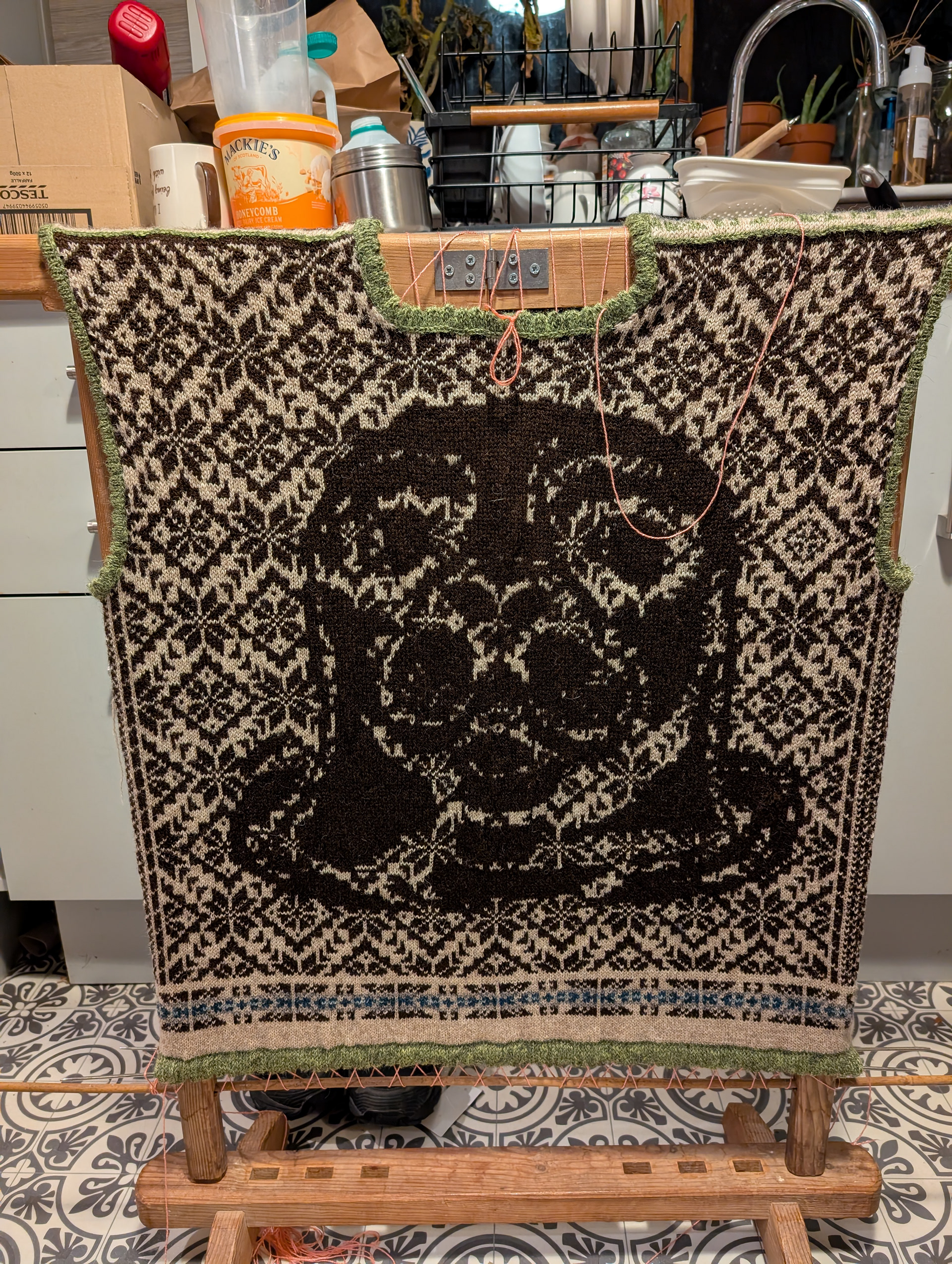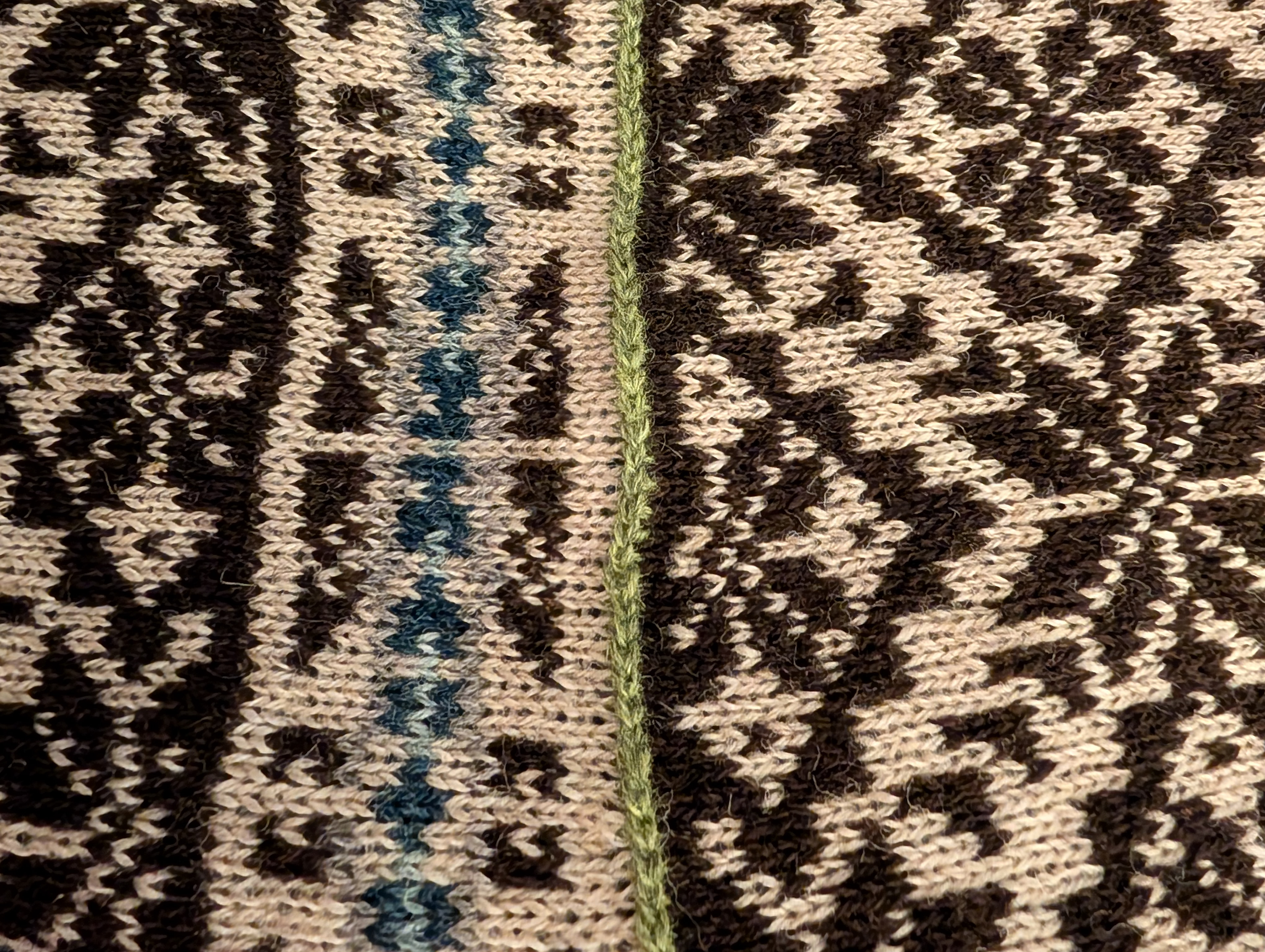 Oscar and Sunshine vest commissioned to honour two very good boys (and a special birthday boy). Machine knit intarsia using yarn spun and dyed locally, Whitby, 2020