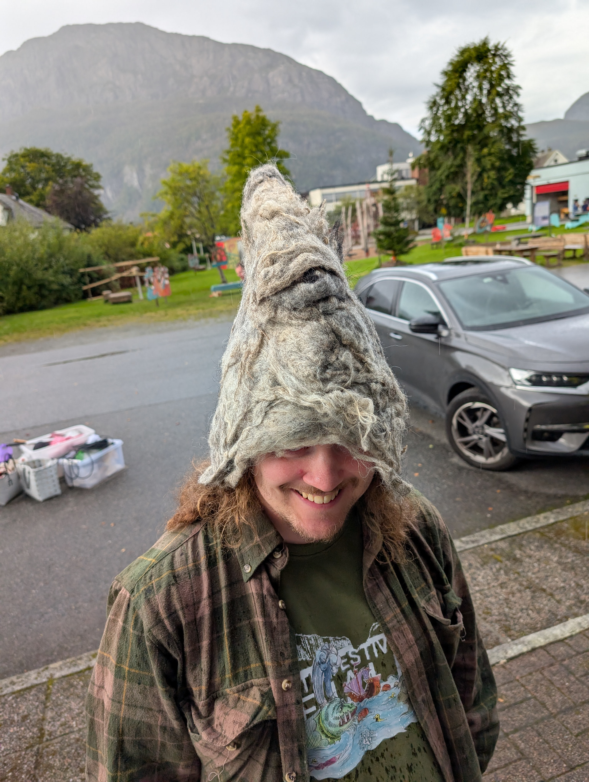 In my time at Velferden I wanted to work with the wool spontaneously, absorbing the spirit and physicality of the landscape and relaying it through the labour of felting, spinning and knitting. Wool shorn from a sheep holds its form, more or less, and so a facsimile of the animal can be unfolded with all its mountainous variations of colour and texture intact. Felting preserves what the sheep grew and the artistry in nature. Spinning and knitting means processing the fibre, like titanium from dark stone, from rough and dirty into something controlled and uniform. Part of this process is separating the fluffy wool from the long guard hairs that protect the Norwegian sheep from the elements but also are also the source of their rejection for being hard to work with. Spinning with the hairs takes a different kind of time and care to wooly roving but is a reminder not to discount the waste product if you can.