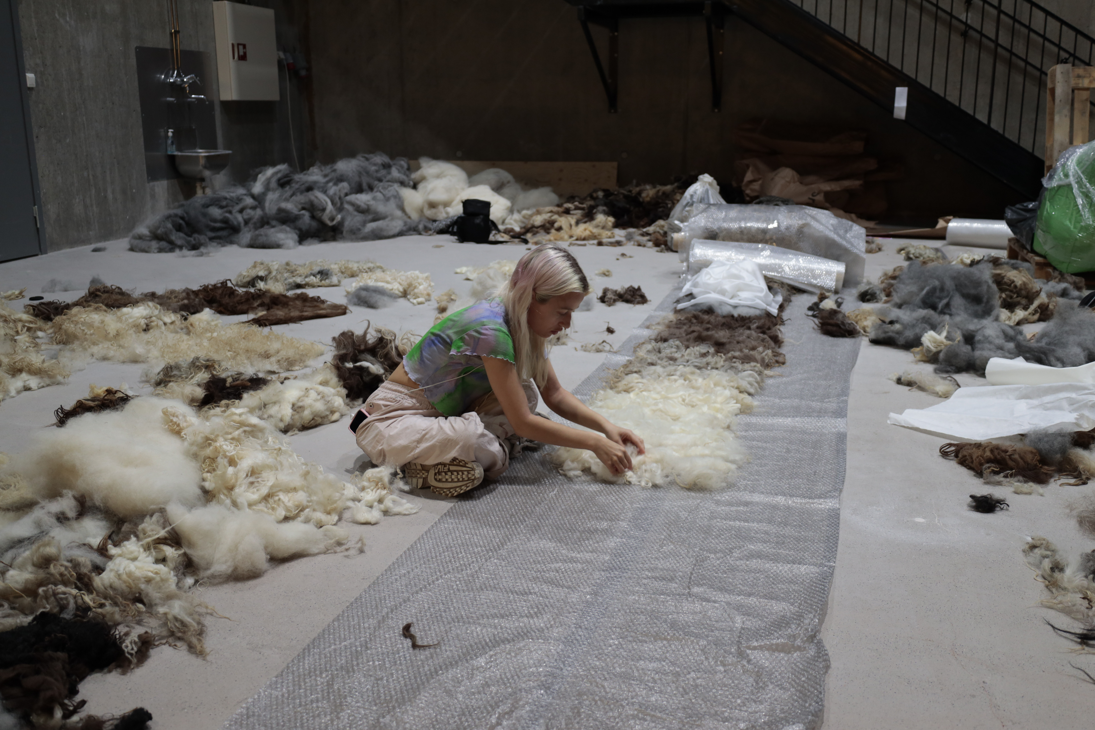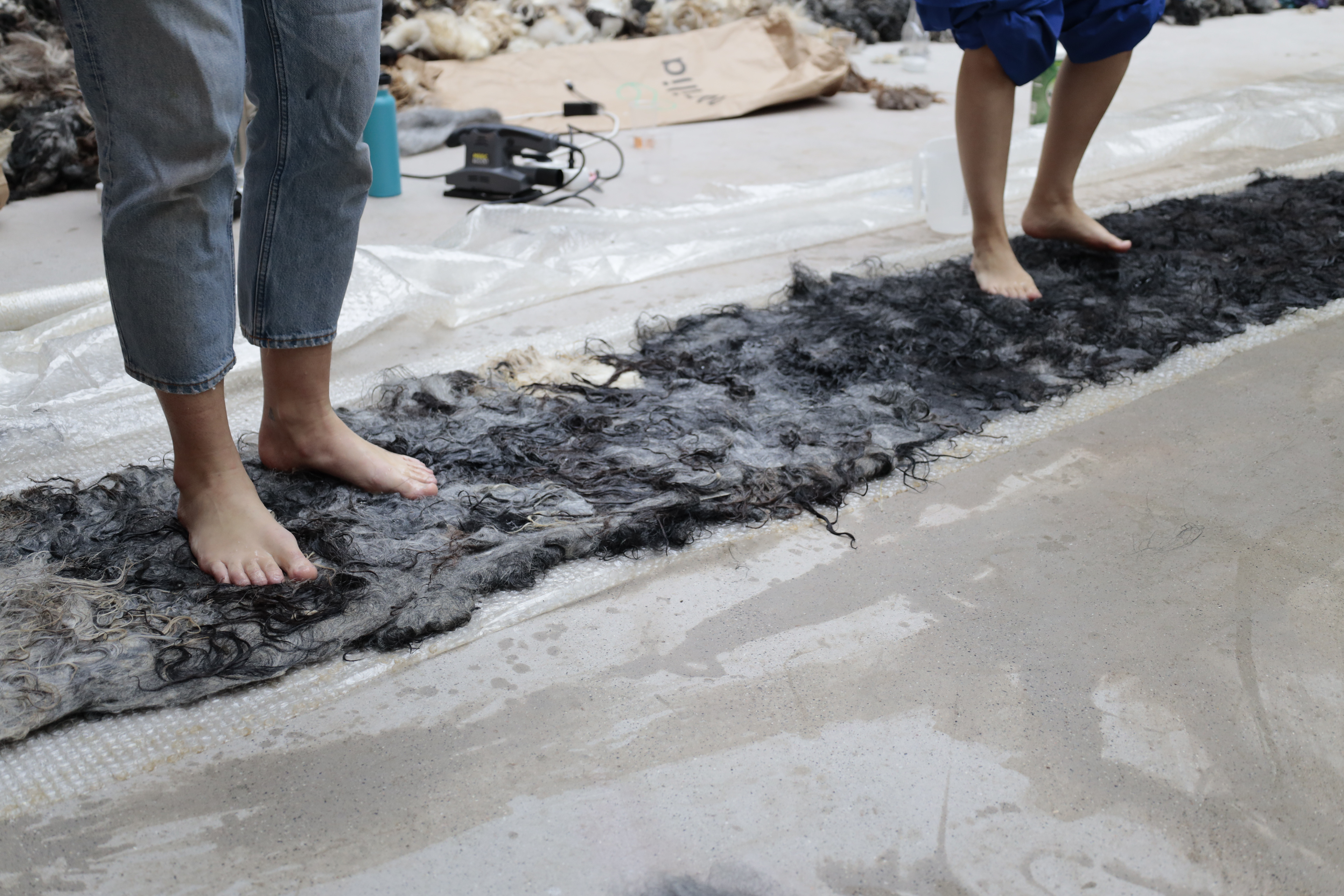 Shepherd's Bridge is 20 meters of felted raw Norwegian fleece. The piece was wet felted by hand (and foot). Dozens of unprocessed fleeces were sorted by colour and texture and brought together into a continuous fleece which retains the vegetation, mud and musk of the sheep in its curls. The work is strengthened with a silk co re and contains the remains of washi paper messages from our visit to Japan which partly inspired the work. The steel fixtures were made by Kevin Axelsson to our specifications.